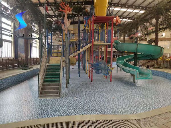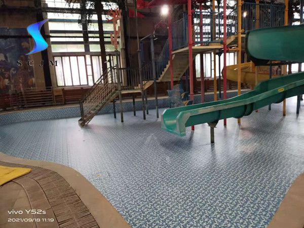 本項(xiàng)目位于北京市,為室內(nèi)水上樂園項(xiàng)目,原基礎(chǔ)為馬賽克瓷磚,局部有脫落、開裂問題,采用1.5mm泳池膠膜施工安裝,采用滿刮膠工藝熱熔焊接。施工安裝之前瓷磚損壞部分做找平處理,泳池膠膜施工安裝完畢后,整體比較平整、美觀?,F(xiàn)場效果如下: