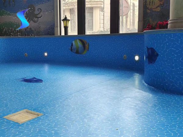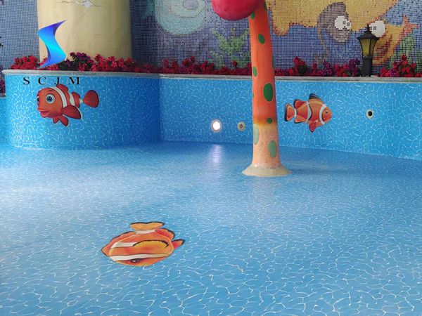 本項(xiàng)目位于北京市,為室內(nèi)戲水池,原基礎(chǔ)為馬賽克瓷磚,裝修改造更換泳池膠膜,表面附有海洋生物圖案膠膜,整體效果如下: