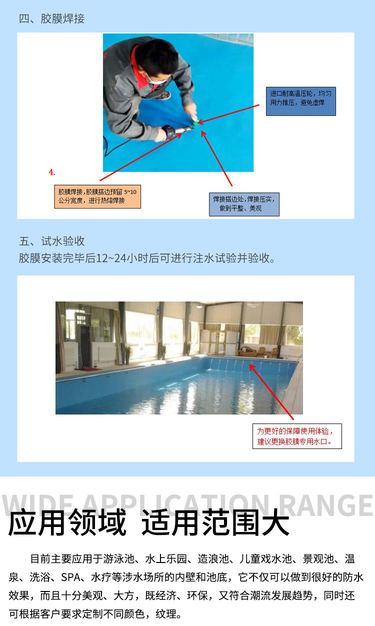 確實是這樣,安裝游泳池膠膜的工藝有多種,這個需要根據(jù)個人情況選擇,一分錢一分貨,要想做的效果更佳,那就需要多投入一點費用,總之這幾種工藝都可以,但是就安全牢固來講,推薦使用滿刮膠工藝。